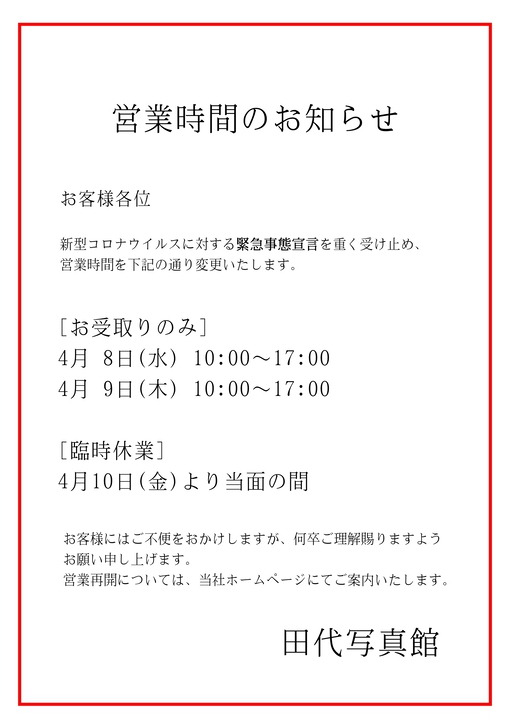 新型コロナウイルスに対する緊急事態宣言を重く受け止め、営業時間を変更いたします。