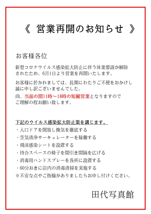 新型コロナウイルス感染拡大防止に伴う休業要請が解除されたため、6月1日より営業を再開いたします。